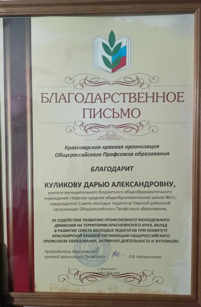 7 ноября 2025 в рамках мероприятия, посвящённого десятилетию Совета молодых педагогов при комитете краевой организации Профсоюза, Дарье Куликовой было вручено Благодарственное письмо за содействие развитию профсоюзного молодёжного движения на территории Красноярского края.